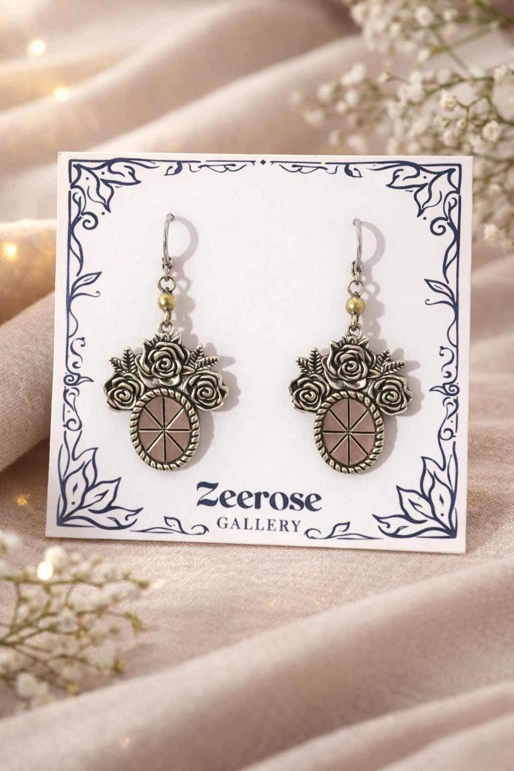 Floral-inspired earrings featuring delicate rose details and a geometric stone centerpiece. A romantic yet artistic design that blends vintage charm with modern elegance.