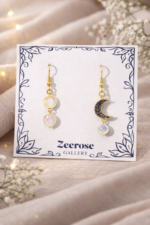 Asymmetrical earrings featuring a sparkling crescent moon paired with luminous opalescent beads. A delicate, celestial-inspired design that captures the magic of moonlight and adds a soft, dreamy glow to any look.