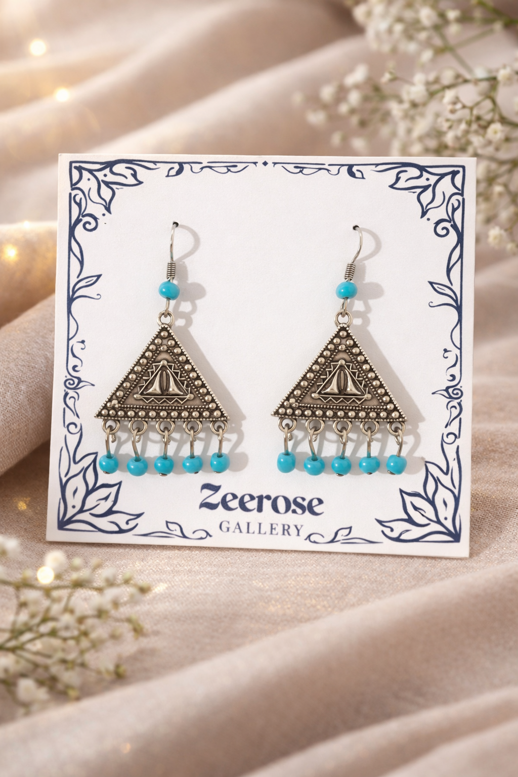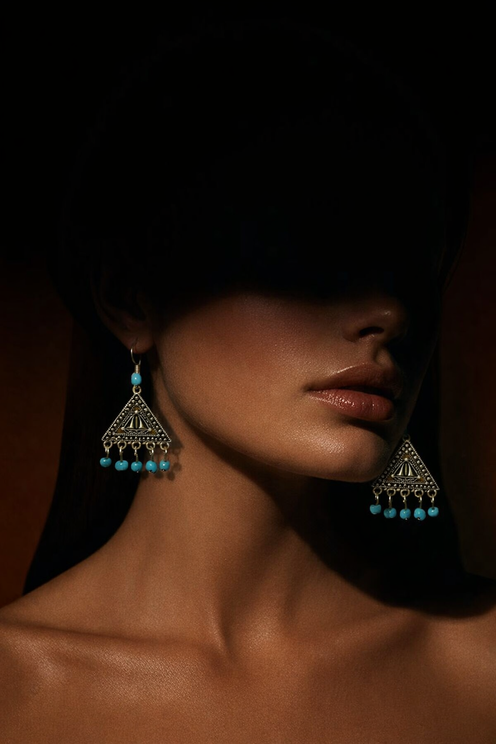 Triangle-shaped earrings featuring intricate engraved details and turquoise bead accents. Inspired by ancient symbols and bohemian style, this unique design adds a mystical and artistic touch to any look