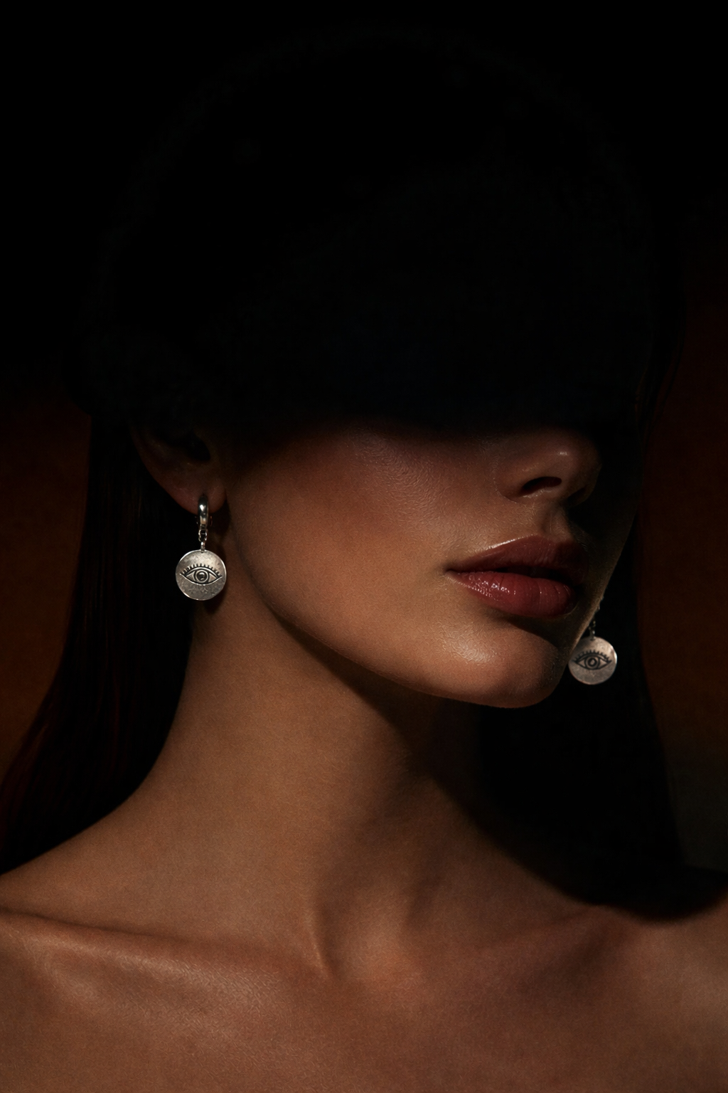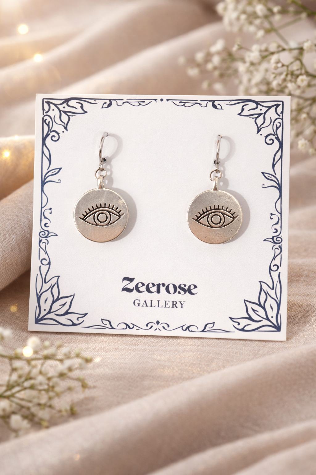 Minimalist silver-tone disc earrings engraved with the protective evil eye symbol. A clean, modern design that represents protection and awareness, perfect for effortless everyday style.