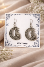 Moon & Wolf–inspired earrings featuring an intricate design that symbolizes strength and freedom. A unique statement piece that adds a touch of mystery and elegance to any look