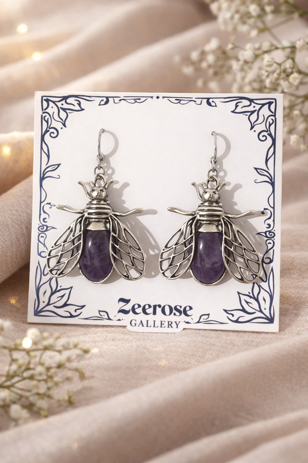 Bee-shaped earrings adorned with a rich purple stone and delicately detailed silver wings. Inspired by nature, this unique design symbolizes wisdom, balance, and spiritual energy, adding a mysterious and elegant touch to any look.